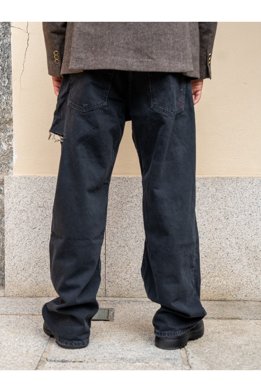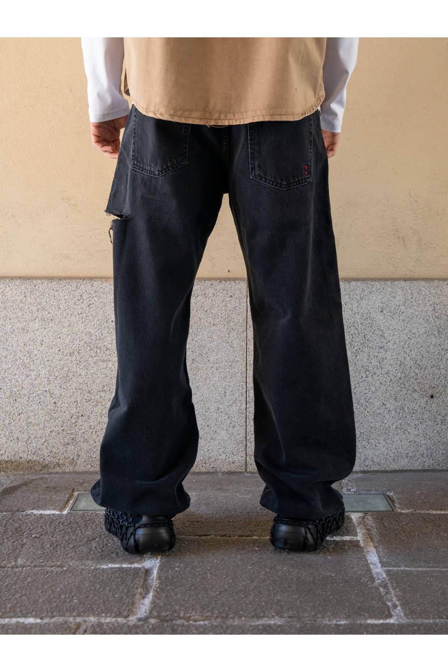 Realizzato in denim premium nero grafite, presenta un fit oversize ispirato agli anni ’90, con gamba ampia e dettagli vissuti che ne esaltano l’autenticità.
