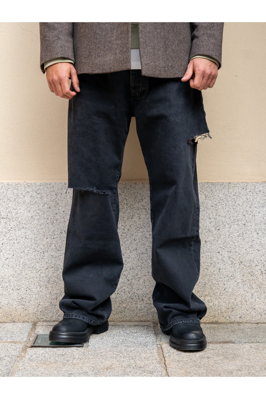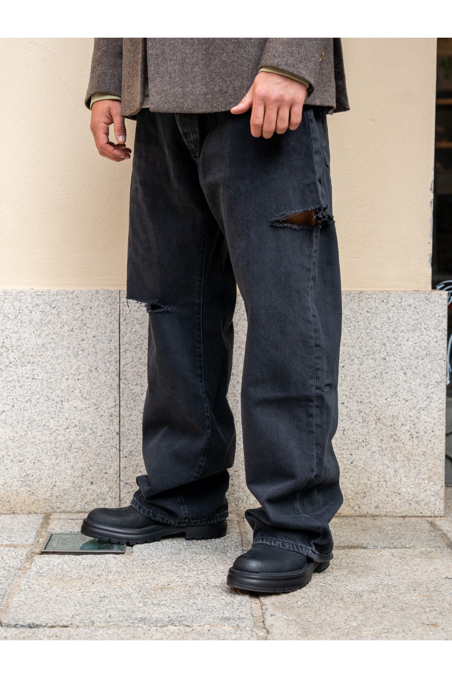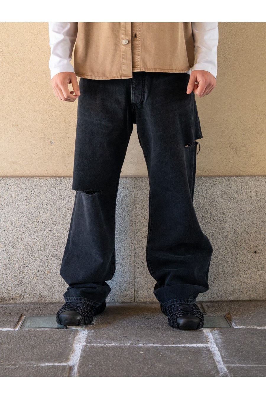 Le strappi frontali destrutturati donano un tocco grunge e street, mentre la texture del denim lavato conferisce profondità e personalità al look.
